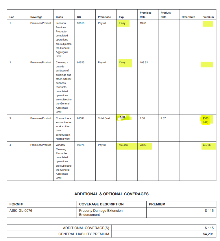 - If an exposure value is less than the expected minimum (i.e. 300), with "If any" deselected, then the system will apply a Minimum Premium (i.e. if 100 is entered then min. prem. applies, see Loc. 3 example below)